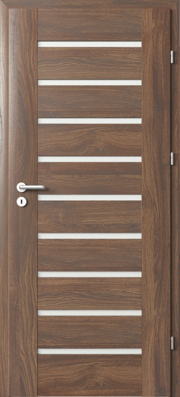 Canatul este acoperit cu furnir natural de tip select care garantează păstrarea uniformității la nivelul nervurilor și culorilor. rama mdf este furniruită în nuanța canatului. șipcile de fixare a elementelor din sticlă sunt furniruite în nuanța canatului.